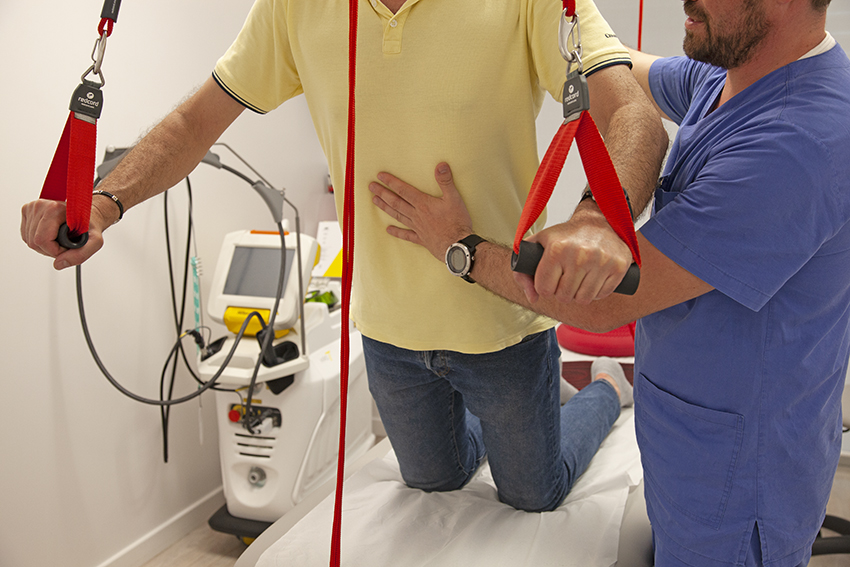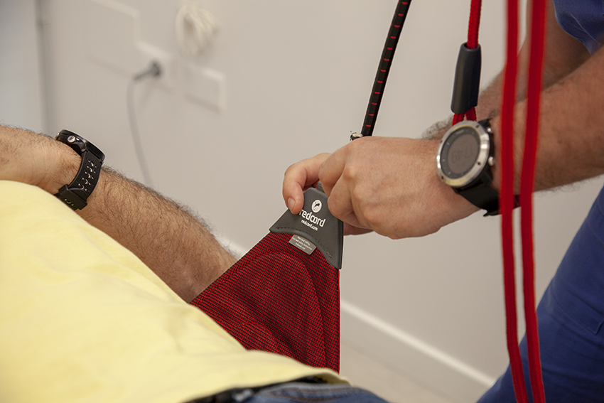 Dopo una prima valutazione, si inizia il trattamento per la riabilitazione neuromuscolare e per il recupero delle varie disfunzioni motorie, grazie al lavoro svolto con attrezzature quali corde, funi, fasce, rigide o elastiche, in una postazione chiamata Redcord.